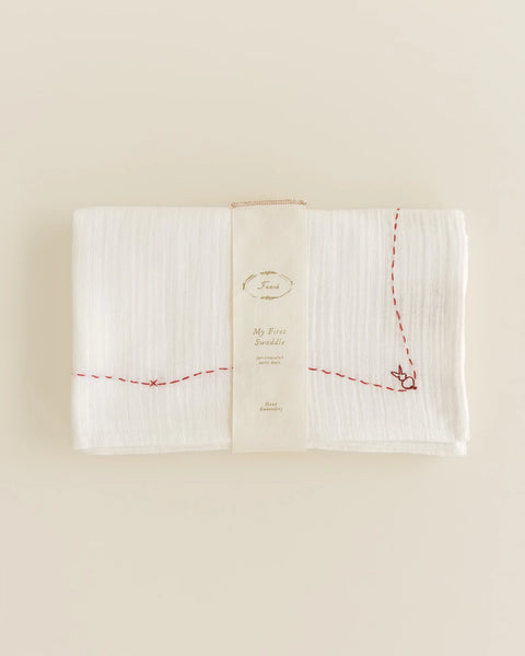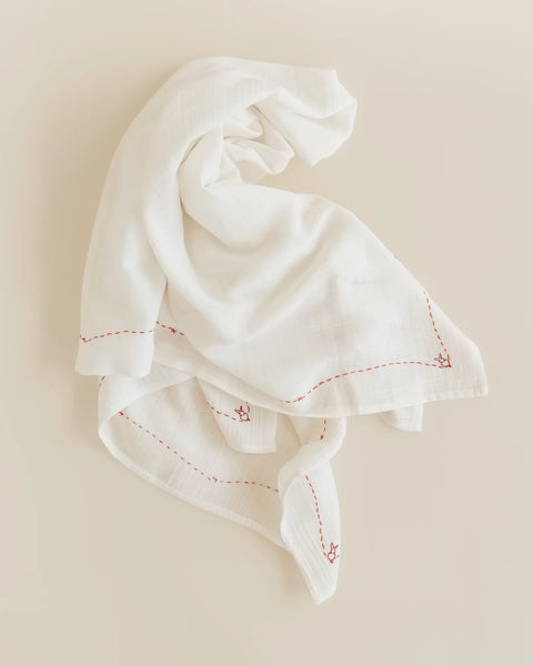 A soft heirloom hand embroidered swaddle in organic double gauze.