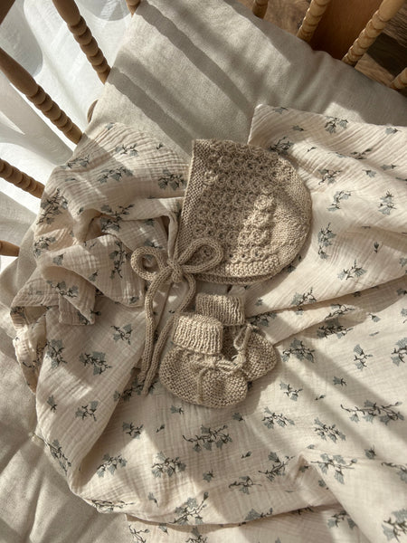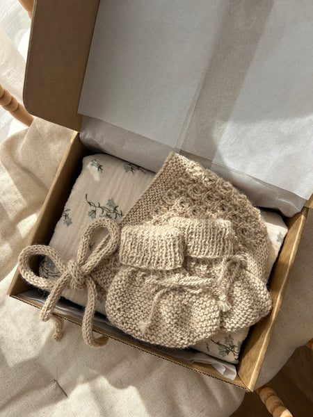 Thoughtfully curated with Garbo & Friends popular Bluebell Swaddle and hand knitted bonnet and booties, this set includes: