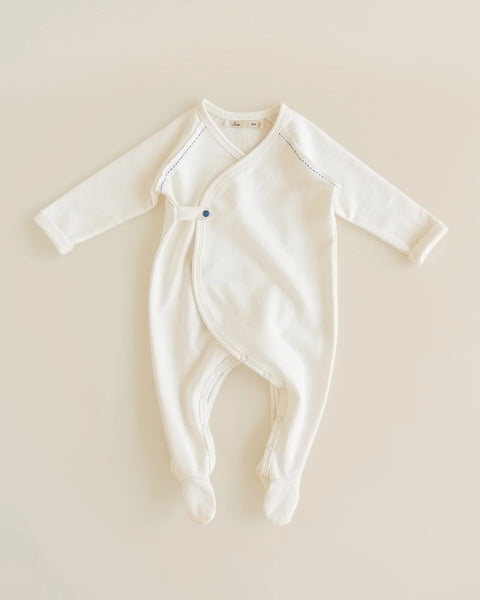 Kimono footie in the softest organic cotton, featuring a delicate stitching detail and a flap for secure and easy change. Transition from sleep to play in this favourite. Kimono style for easy dressing. Matches back to the milk stitched beanie.
